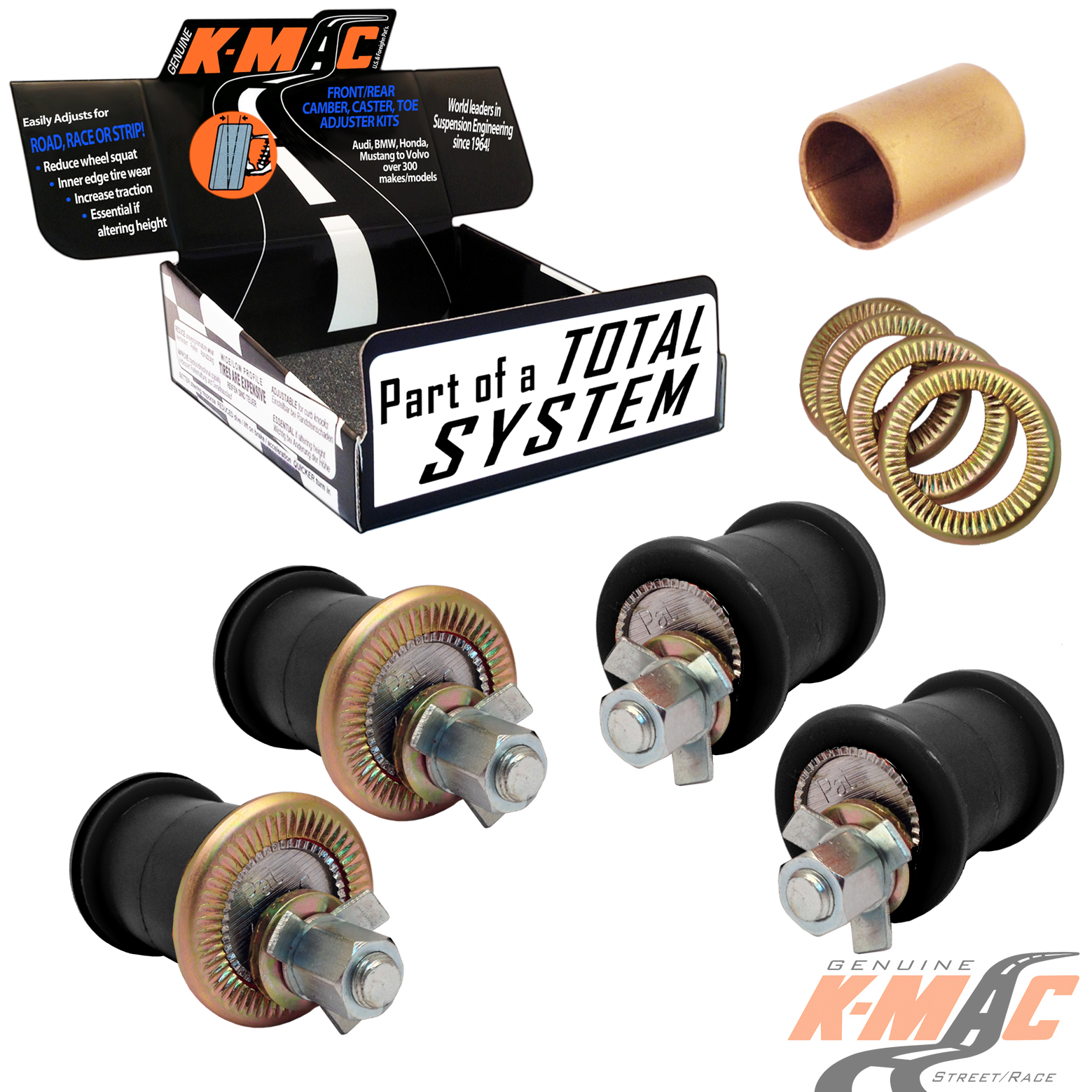 PRODUCT : Allows precise BMW E23, E24, E28, E32, E34 Rear Camber & Toe Bush Kit Bushing adjustment for the first time. Genuine K-MAC BUSHINGS – Designed for absolute maximum adjustment range. Strongest and longest lasting. Featuring twice the load bearing area of OEM bushes. Hardened teethed nickel chromed steel centers with spiral grease grooves. Hardened teethed external steel washers. Double length nuts. Fail safe lock system. With the K-MAC unique patented design there is no more dis-assembly required each time an alignment setting needs to be changed. – Just a single wrench to adjust accurately (under load) direct on alignment rack.