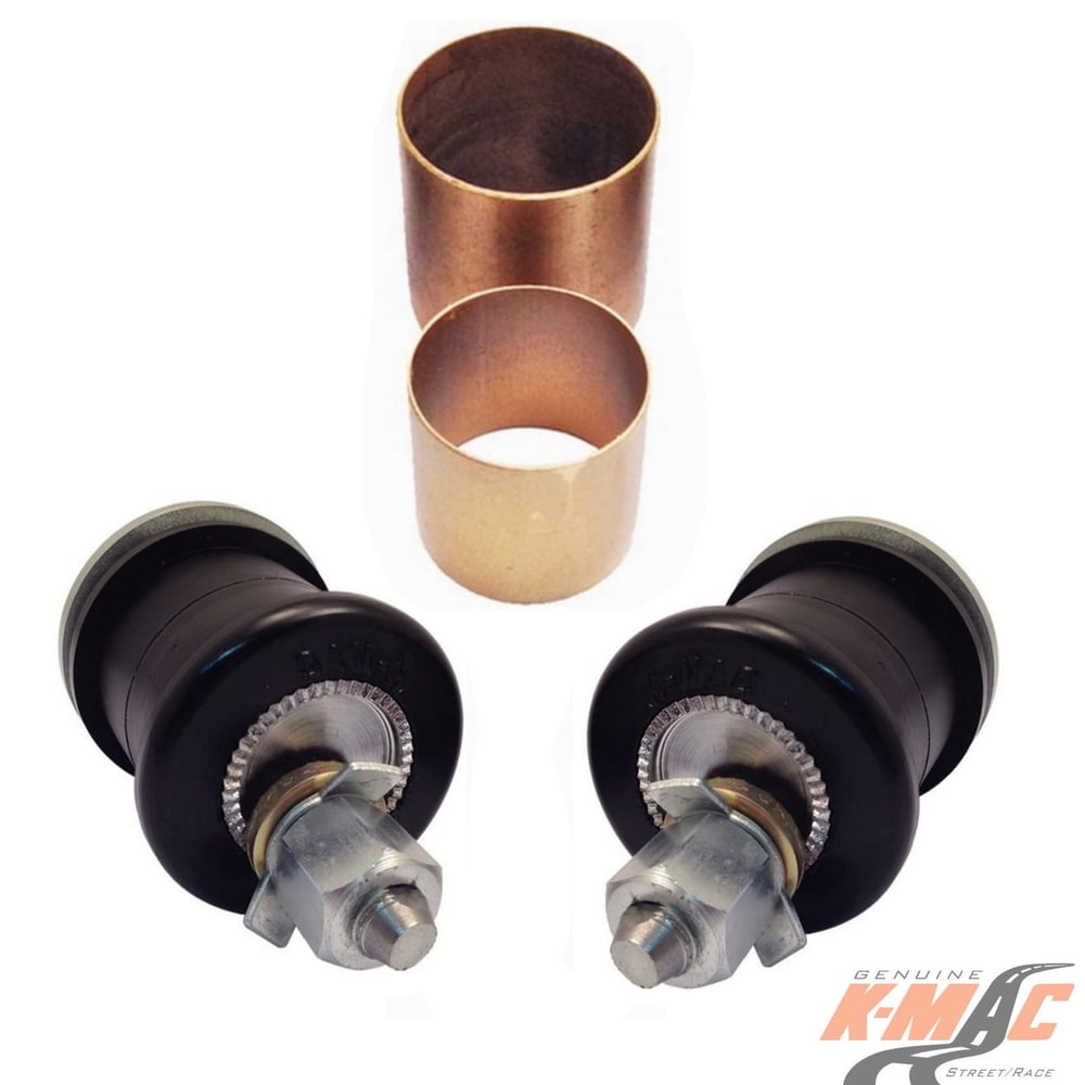 * ALSO SEE COMPLETE RANGE OF “FRONT AND REAR PRECISELY ADJUSTABLE CAMBER, CASTER, TOE BUSHINGS ” All the very latest K-MAC design breakthroughs to resolve premature bush wear. Most bushings feature twice the load bearing area of OEM and are 2 axis / self aligning – without the use of air voids. Result is improved brake and steering response. The Camber, Caster and Toe bushings are also precisely adjustable (unique K-MAC patented design – single wrench on car, allowing accurate adjustment “under load” direct on alignment rack). With the “Camber” bushings providing also “extra” track width (and negative adjustment) on race days.