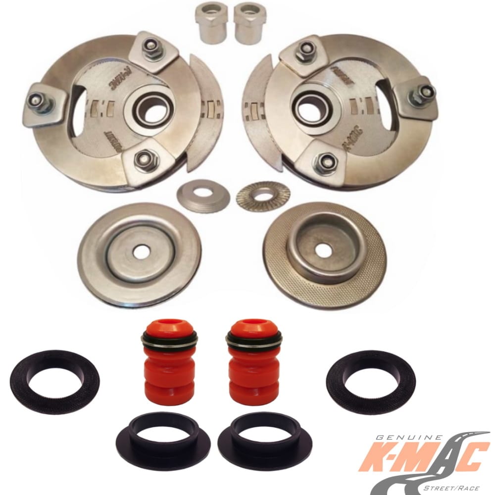 ANOTHER KMAC UPDATE INCORPORATED INTO THE DESIGN : With KMAC we do not rely just on the “single spherical ball” instead separate radial thrust bearings are included to take the “Steering Loads” (which also resolves annoying spring drag/ noise/ binding). Massive 85mm (3 3/8″) diameter fully sealed bearings (again by far biggest in the industry) and also included are OEM diameter alloy top spring seats (along with separate seats to suit all brands of coil overs 60-70mm I.D.).
