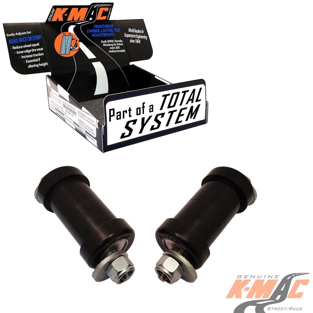 The Camber, Caster and Toe bushings are also precisely adjustable (unique KMAC patented design – single wrench on car – accurately under load direct on alignment rack). With the lower arm “Camber” bushings providing also “extra” track width (and negative adjustment to further reduce understeer) on race days.