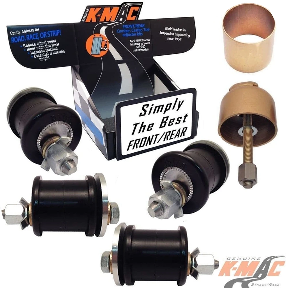 THIS REAR KMAC ADJUSTER KIT HAVE DESIGNED TO BE BOTH MORE EASILY ACCESSIBLE AND SINGLE WRENCH ADJUSTABLE – accurately (under load – direct on alignment rack) and at the same time replacing the 4 Rear highest wearing suspension bushings.